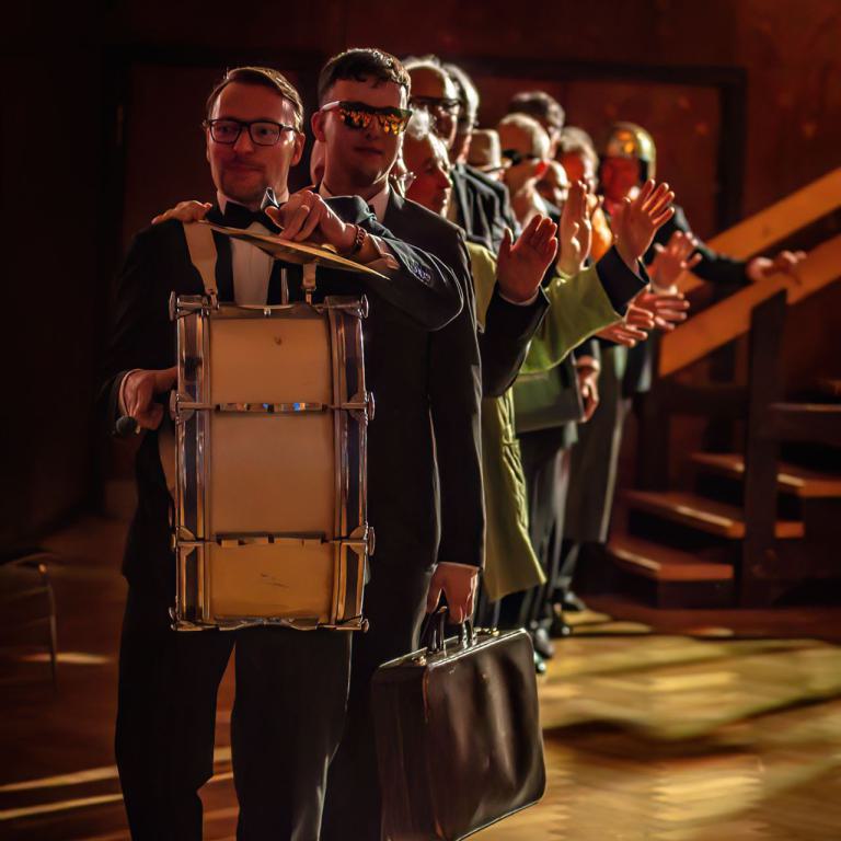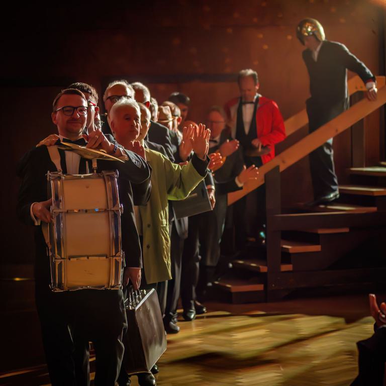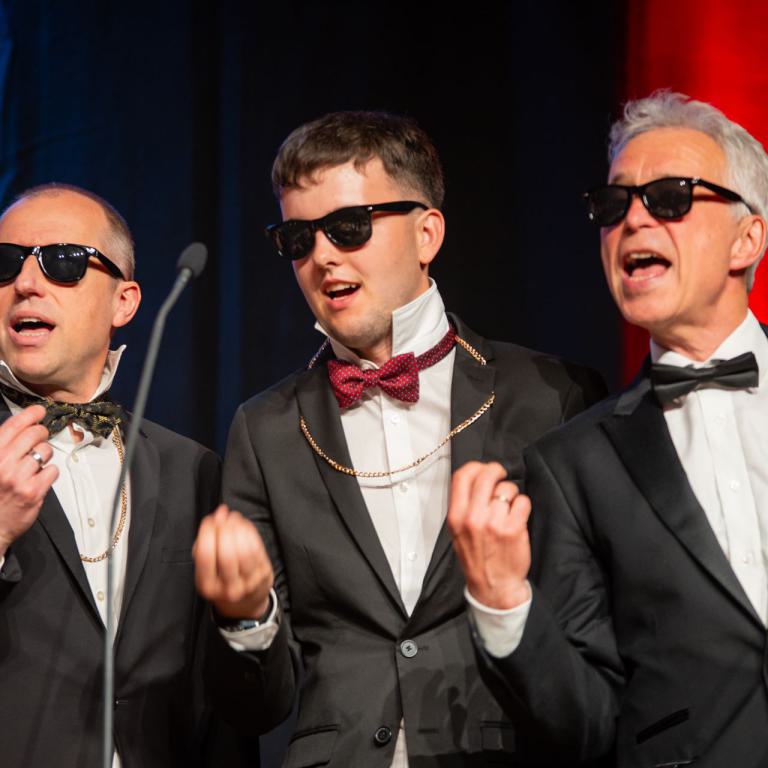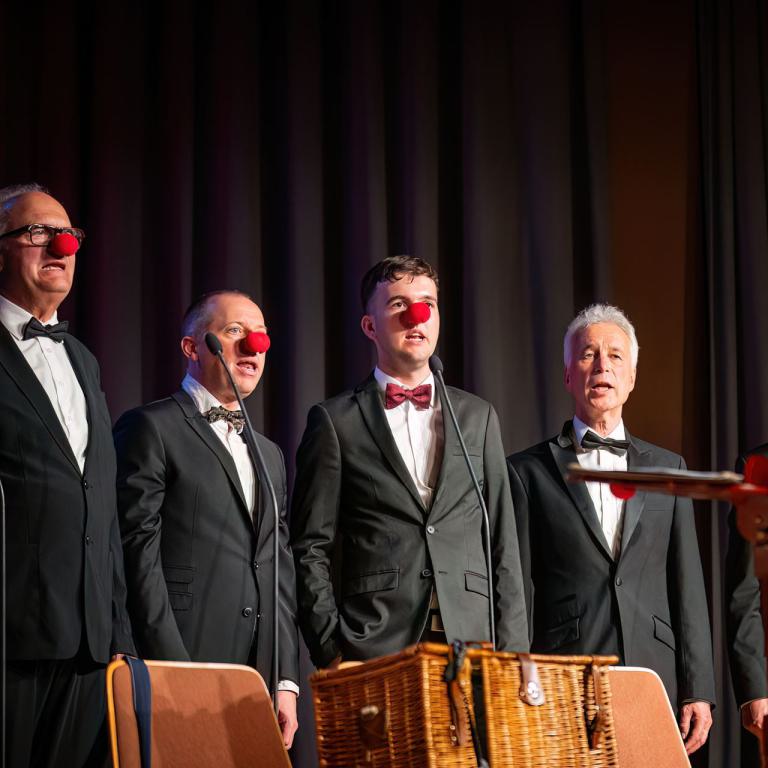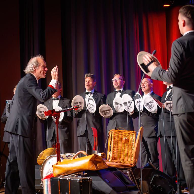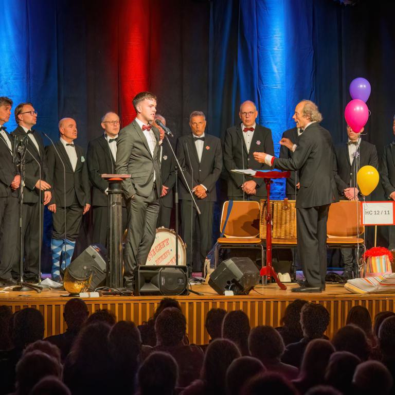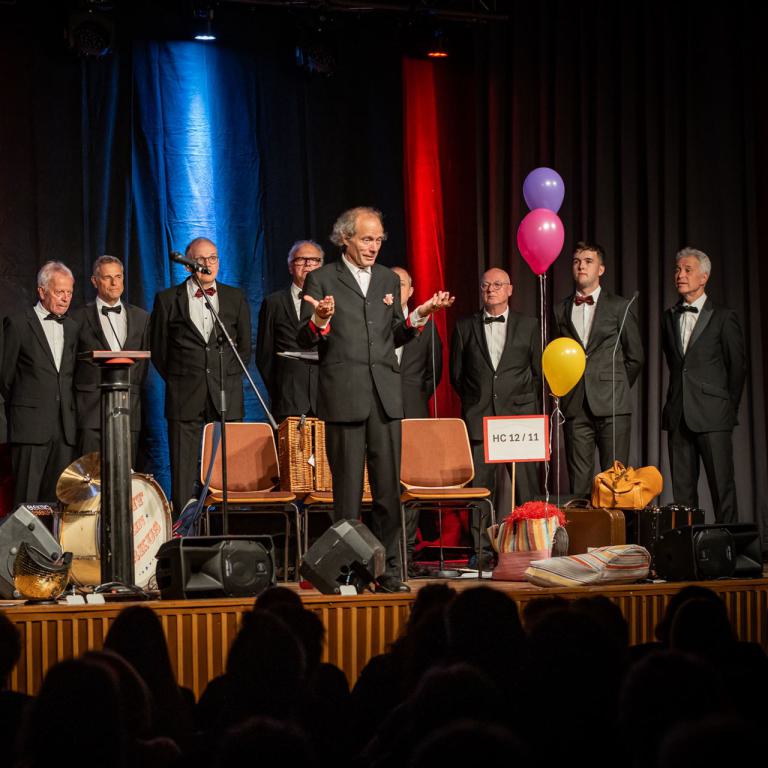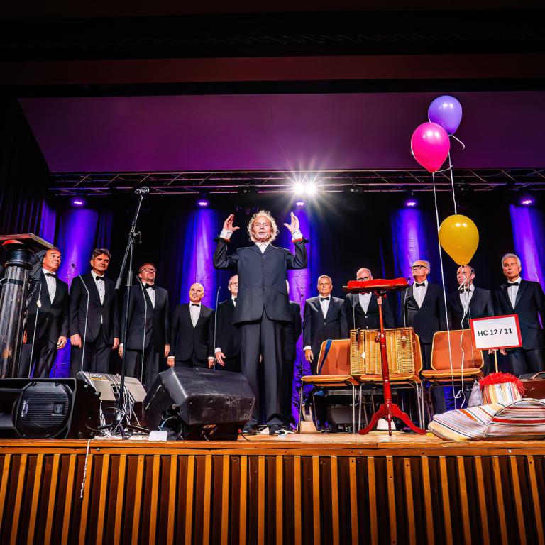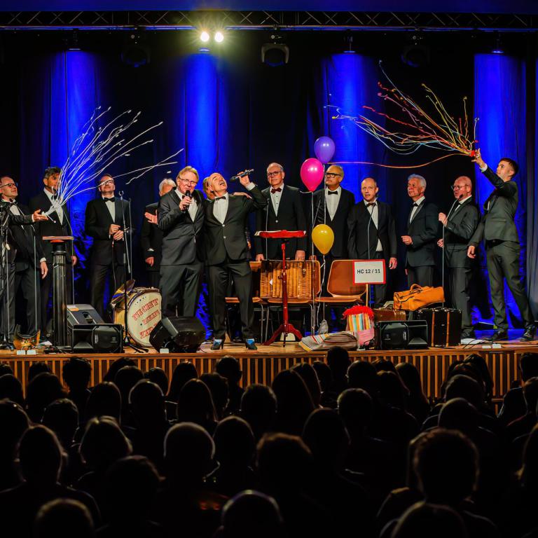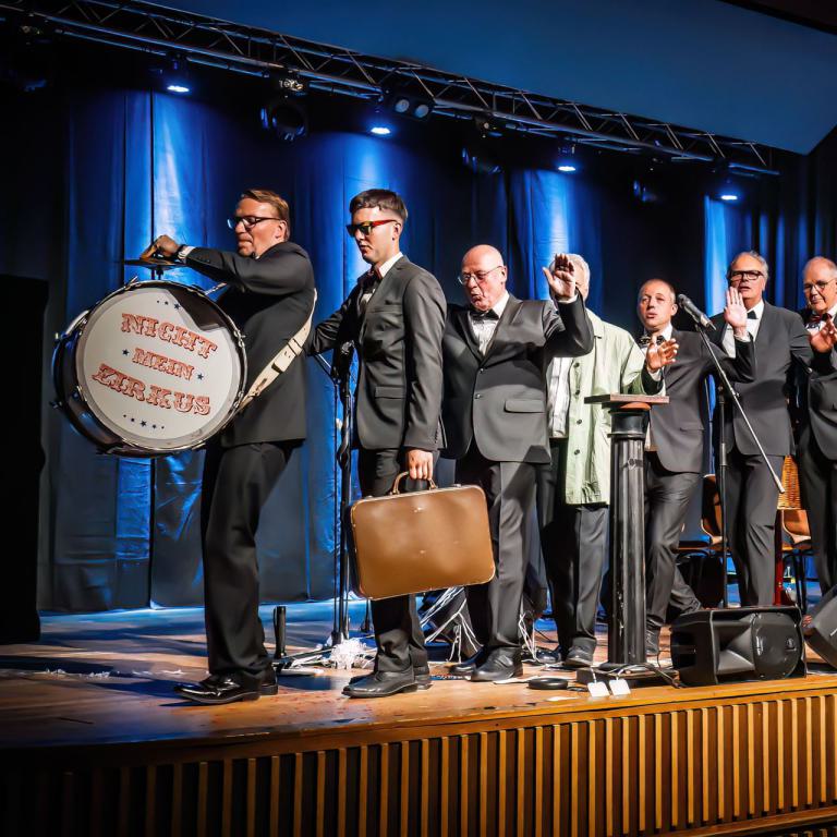 Auch in ihrem mittlerweile elften Programm widmen sich die gestandenen Sänger inhaltlich wieder diversen Männerschicksalen, verarbeiten diese in eigenen Texten und philosophieren insbesondere zwischen den Gesangsstücken über all das, was ihre Geschlechtsgenossen im besten Alter so beschäftigt. Gerne würde man das Problem der schwindenden Haarpracht (genial verarbeitet im Song „Just the two of us“) oder des mangelnden Antriebs zur Veränderung („Woll-pul-lover“) ignorieren, muss sich jedoch ebenso eingestehen, dass Veränderung trotz des Einsatzes eines Change-Managers nicht ganz so einfach ist und man eben doch lieber Trigema statt Armani trägt. Der Titel des aktuellen Programms, „Nicht mein Zirkus“, ist deshalb wohl eher ein Wunschdenken, weswegen der HardChor dann auch konsequenterweise lieber gleich im wahrsten Sinne mit Pauken und Trompeten einzog und die Bühne einen Abend lang zur Manege machte, in der jeder der 14 Männer sich in gebührendem Maße präsentieren durfte.