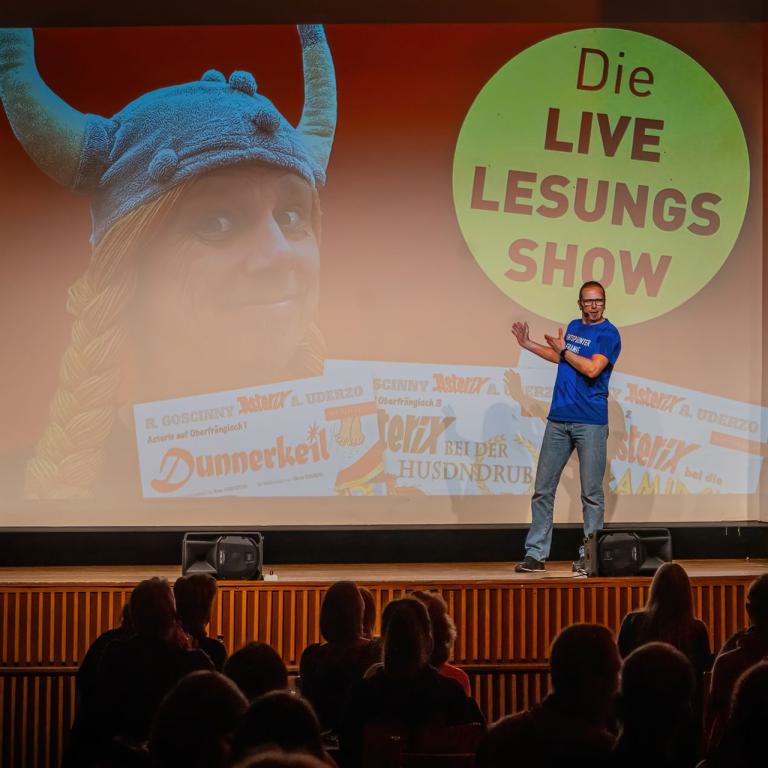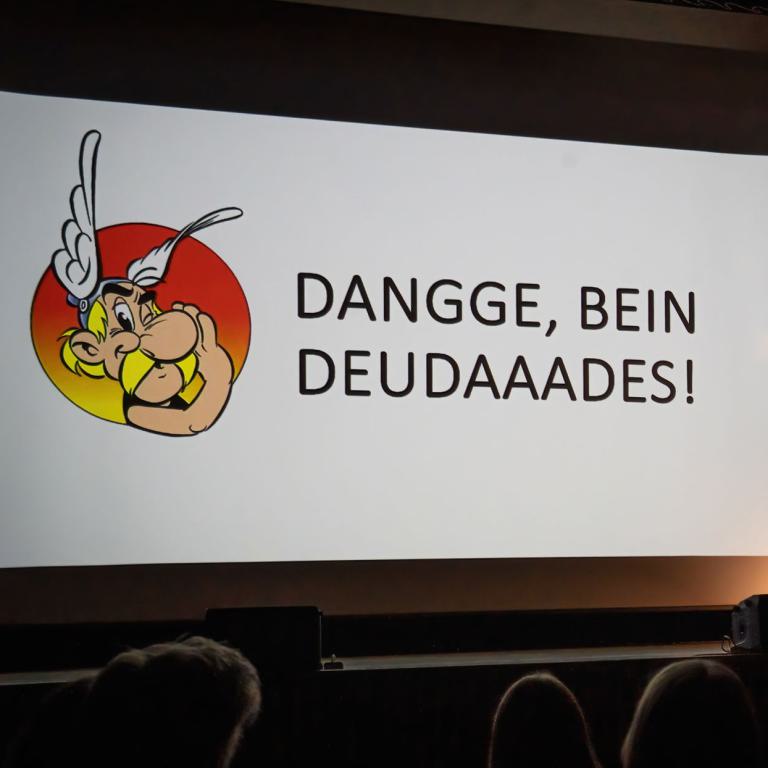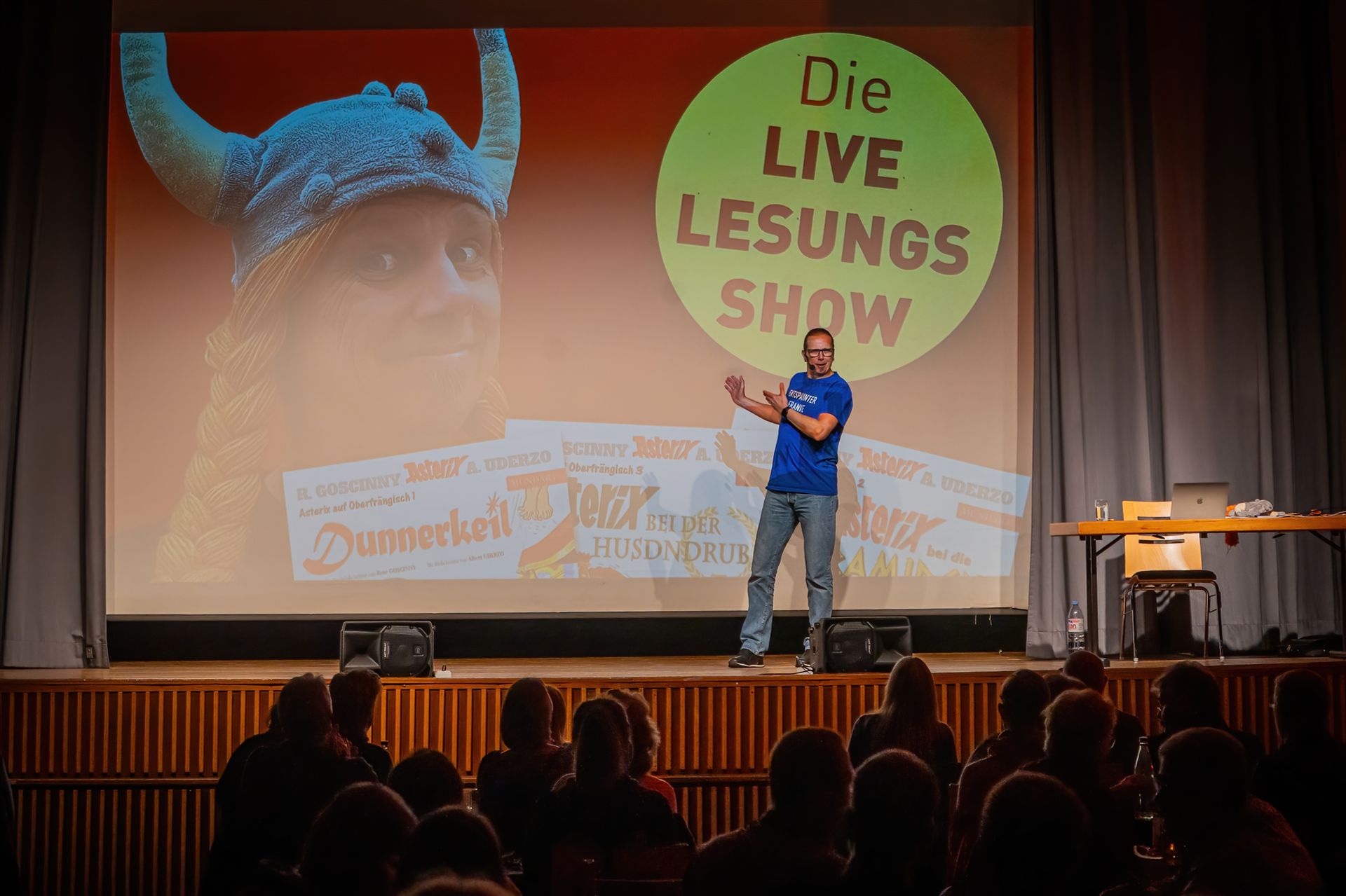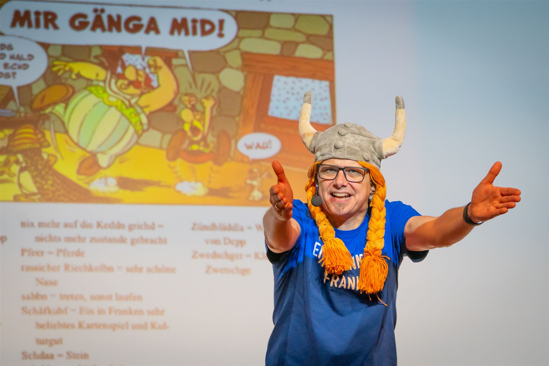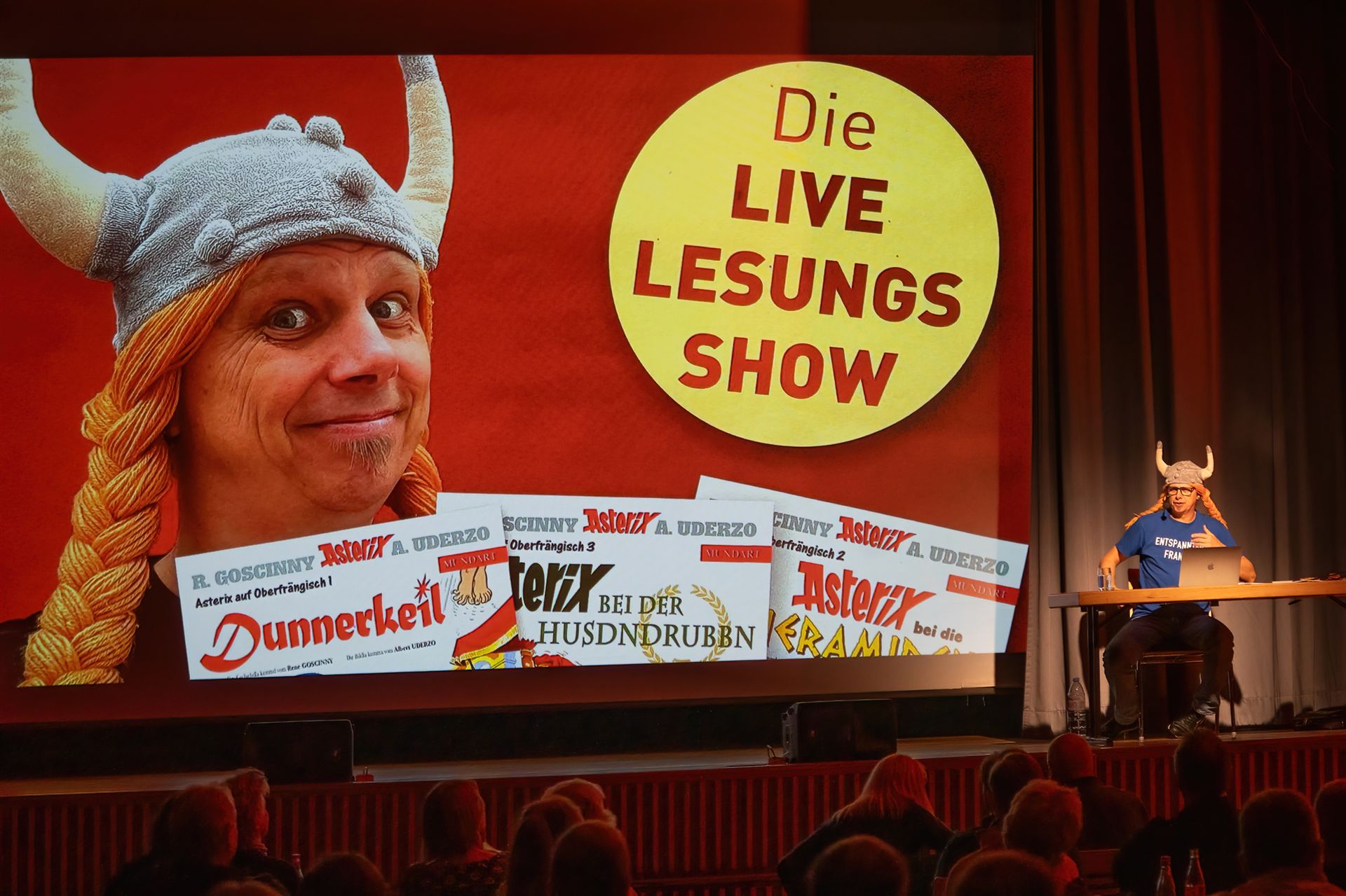 Wer also, wenn nicht Stefan Eichner, könnte prädestiniert dafür sein, einen Mundart-Asterix auf Oberfränkisch zu schreiben. „Denn der hat eindeutig noch gefehlt“, befand Eichner damals selbstbewusst – und sollte Recht behalten: Die Erstauflage seiner Erstling-Bandes „Dunnerkeil“ war innerhalb eines Tages ausverkauft. Mittlerweile sind, beinahe im jährlichen Rhythmus, zwei weitere übersetzte Bände hinzugekommen. Sein zweites, in Osterburken vorgestelltes Werk, “Asterix bei die Bieramiden“, spielt in Ägypten, wo statt der sonst gewohnten Gallier natürlich die unbeugsamen und furchtlosen Oberfranken Asterix, Obelix, Miraculix und die „Fusshubn“ Idefix der ägyptischen Herrscherin Kleopatra dabei helfen, eine ehrgeizige Wette gegen den römischen Kaiser Caesar zu gewinnen; die Handlung dürfte nicht nur eingefleischten Fans bekannt sein.