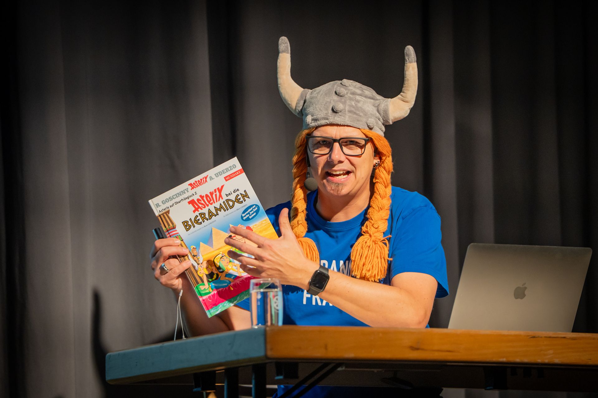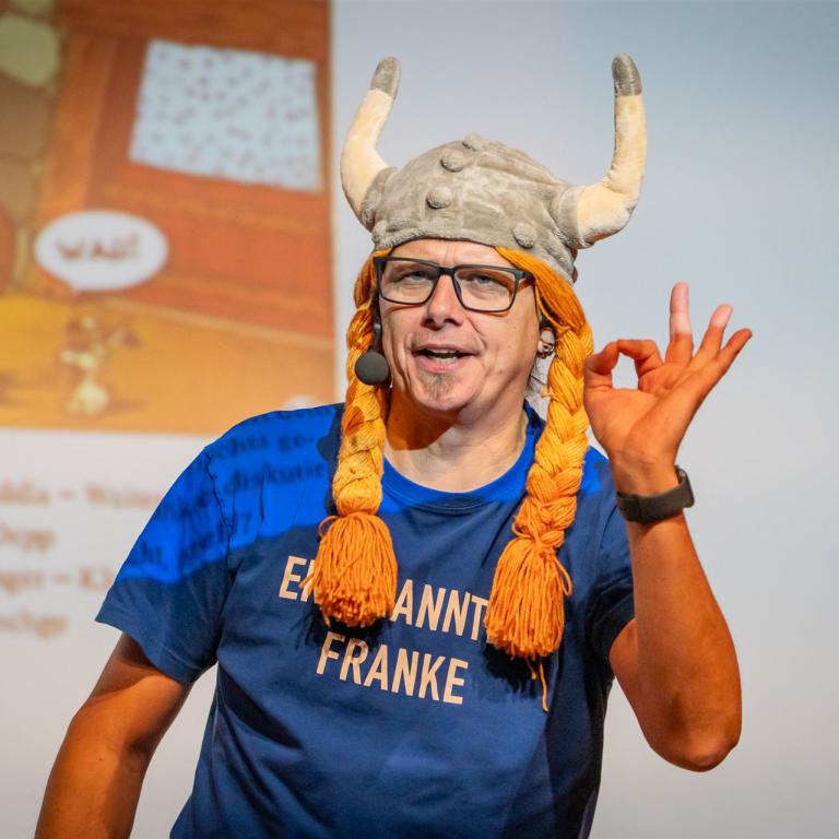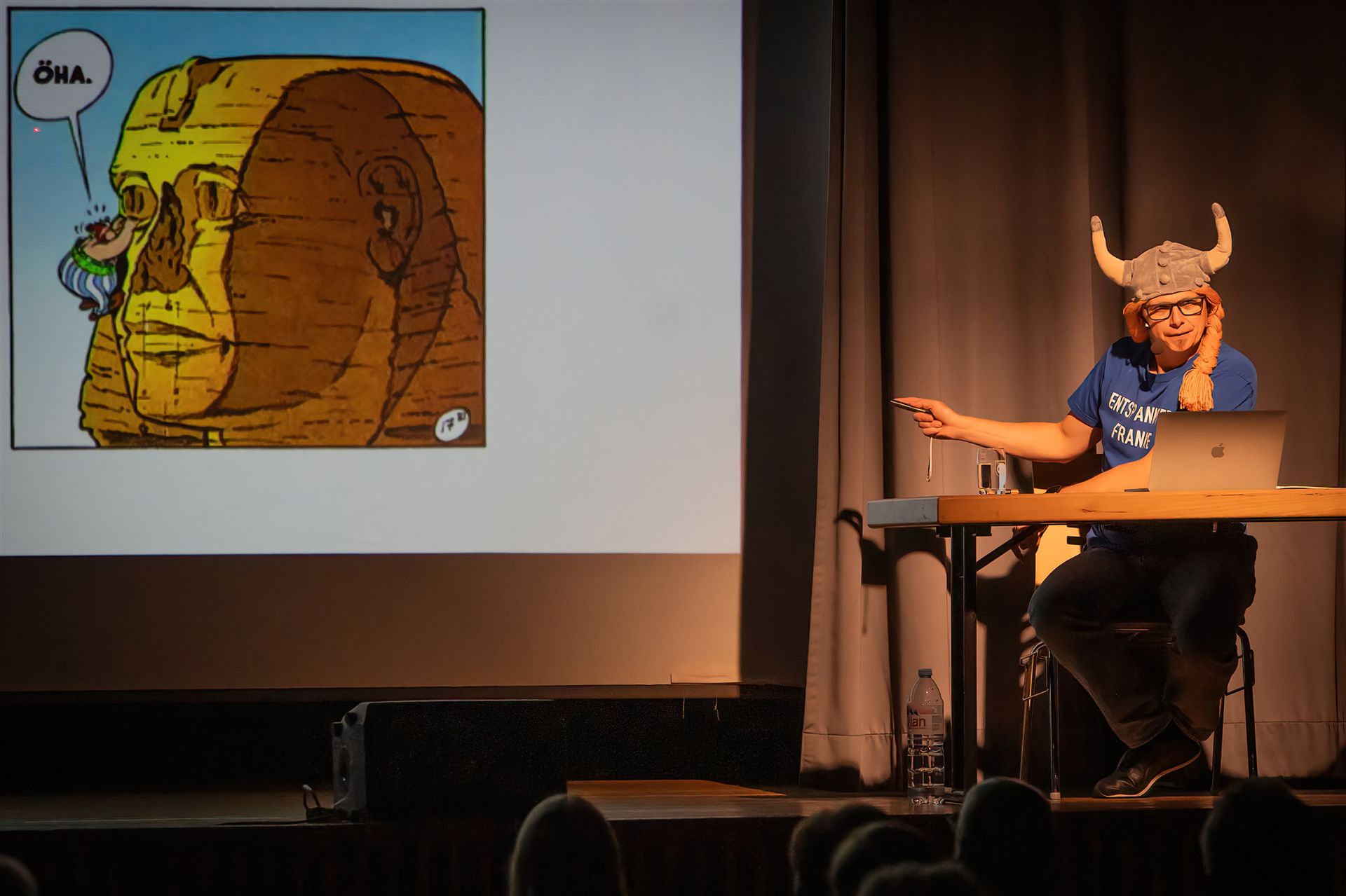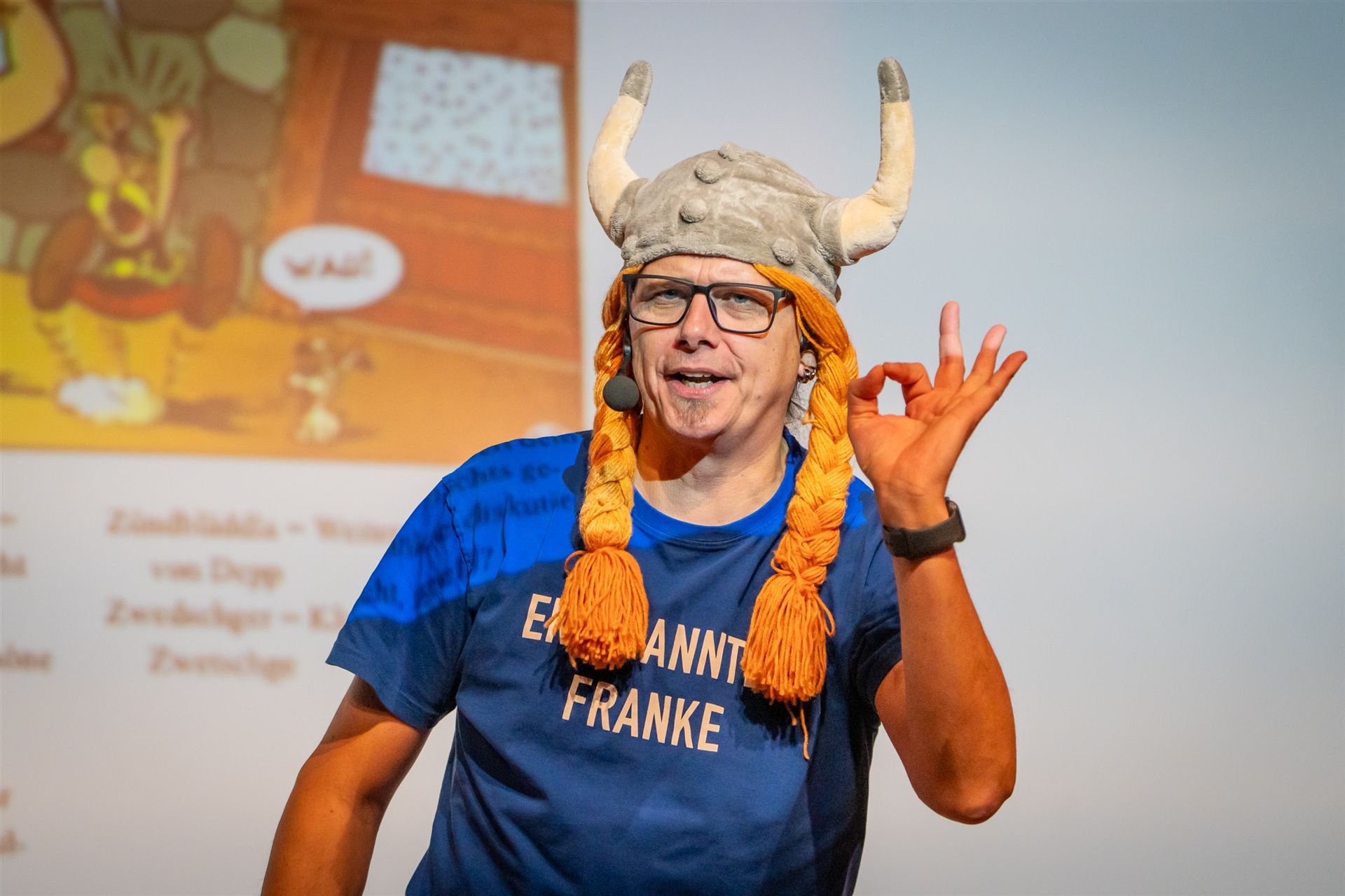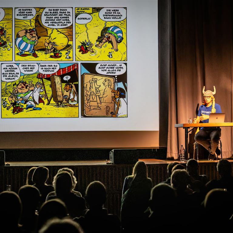 Wer also, wenn nicht Stefan Eichner, könnte prädestiniert dafür sein, einen Mundart-Asterix auf Oberfränkisch zu schreiben. „Denn der hat eindeutig noch gefehlt“, befand Eichner damals selbstbewusst – und sollte Recht behalten: Die Erstauflage seiner Erstling-Bandes „Dunnerkeil“ war innerhalb eines Tages ausverkauft. Mittlerweile sind, beinahe im jährlichen Rhythmus, zwei weitere übersetzte Bände hinzugekommen. Sein zweites, in Osterburken vorgestelltes Werk, “Asterix bei die Bieramiden“, spielt in Ägypten, wo statt der sonst gewohnten Gallier natürlich die unbeugsamen und furchtlosen Oberfranken Asterix, Obelix, Miraculix und die „Fusshubn“ Idefix der ägyptischen Herrscherin Kleopatra dabei helfen, eine ehrgeizige Wette gegen den römischen Kaiser Caesar zu gewinnen; die Handlung dürfte nicht nur eingefleischten Fans bekannt sein.