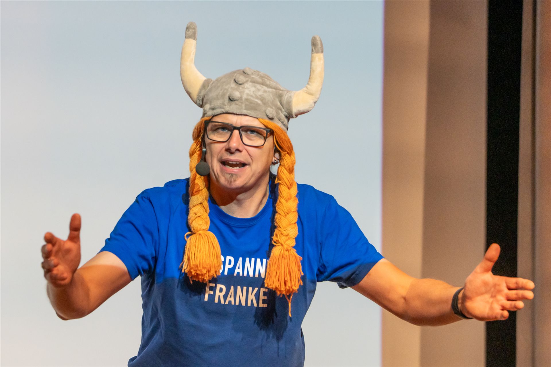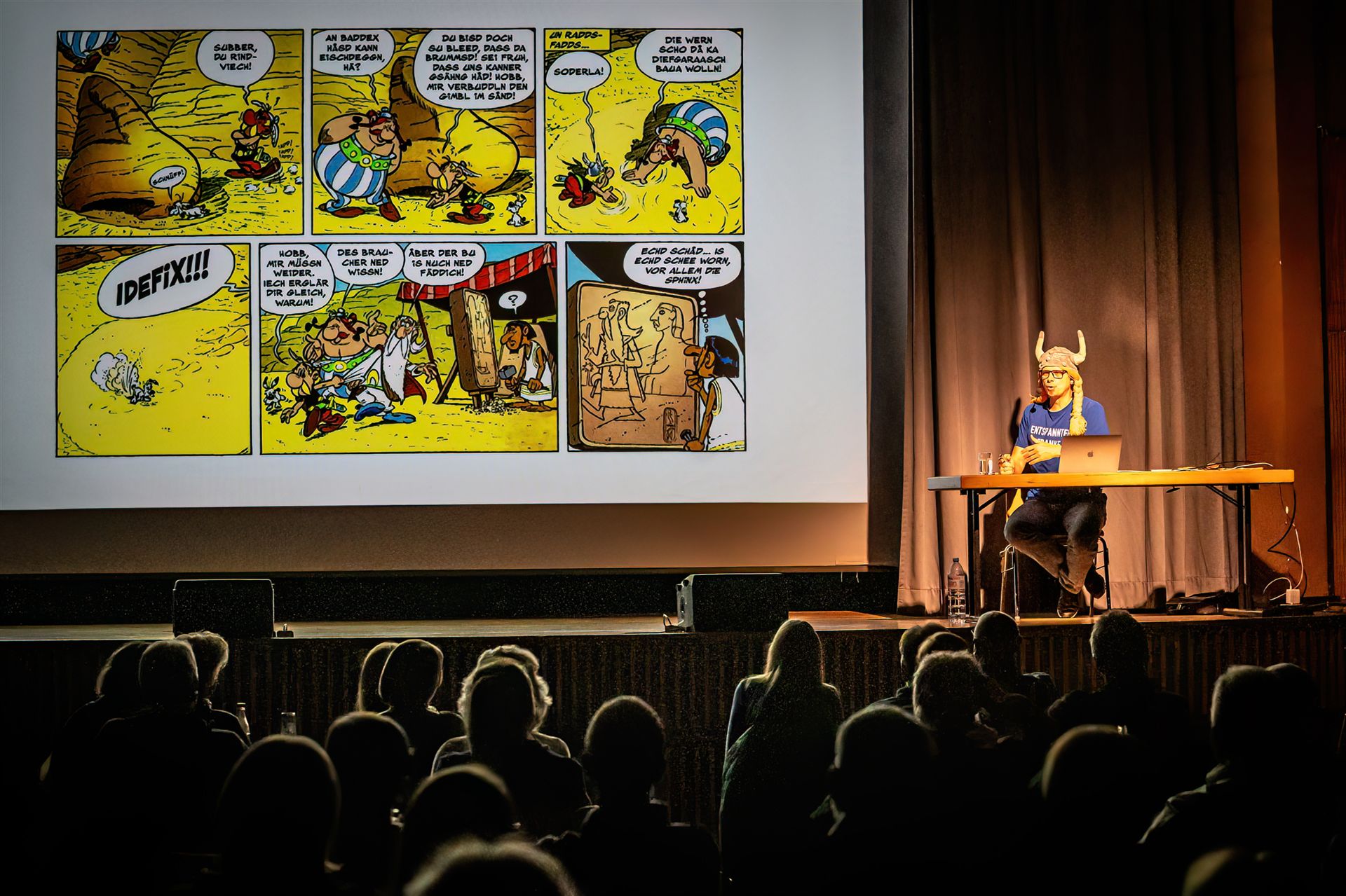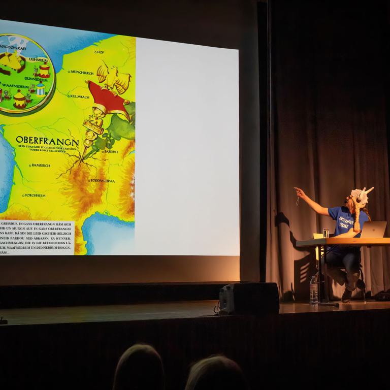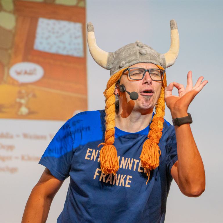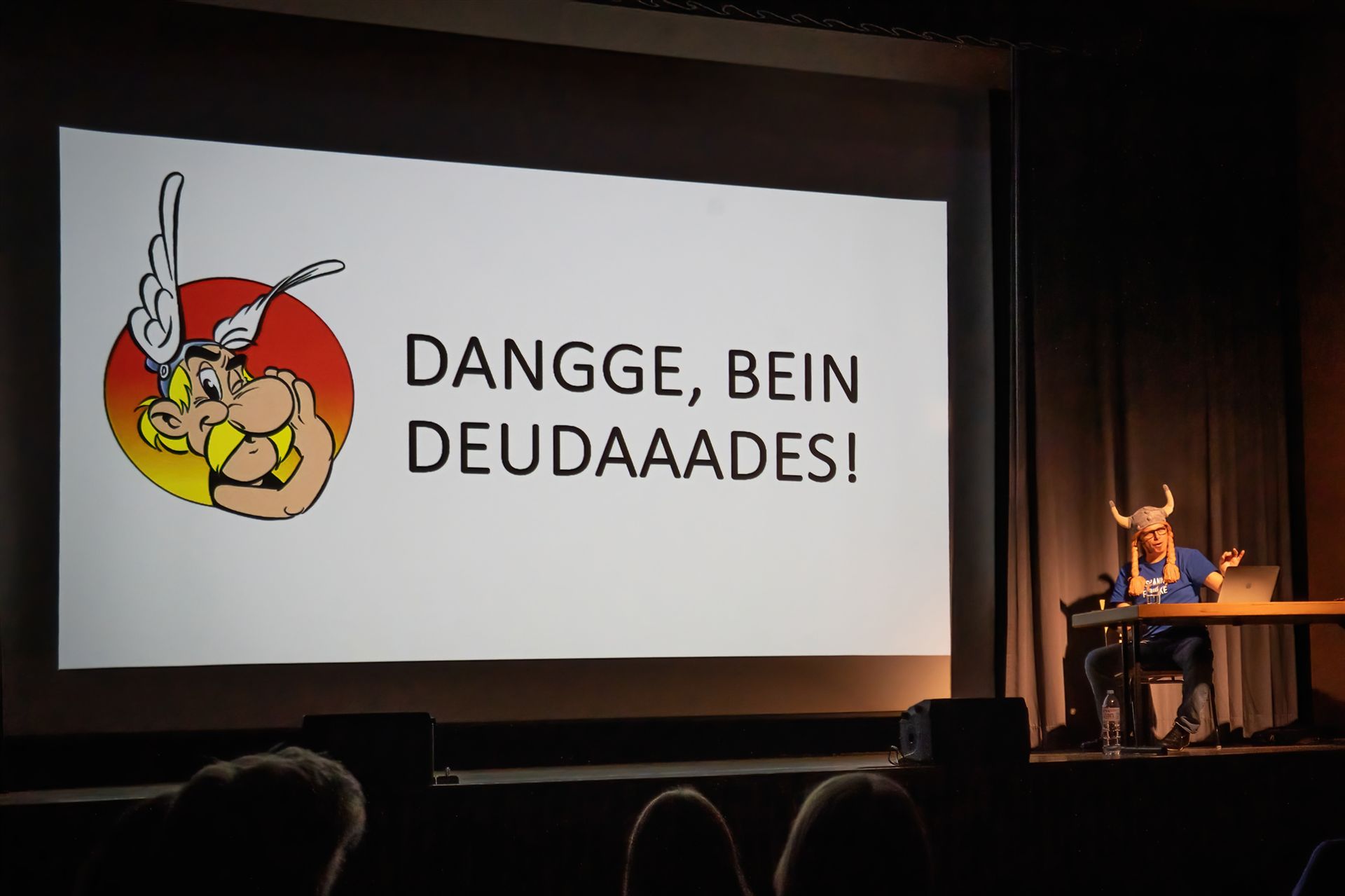 Wer also, wenn nicht Stefan Eichner, könnte prädestiniert dafür sein, einen Mundart-Asterix auf Oberfränkisch zu schreiben. „Denn der hat eindeutig noch gefehlt“, befand Eichner damals selbstbewusst – und sollte Recht behalten: Die Erstauflage seiner Erstling-Bandes „Dunnerkeil“ war innerhalb eines Tages ausverkauft. Mittlerweile sind, beinahe im jährlichen Rhythmus, zwei weitere übersetzte Bände hinzugekommen. Sein zweites, in Osterburken vorgestelltes Werk, “Asterix bei die Bieramiden“, spielt in Ägypten, wo statt der sonst gewohnten Gallier natürlich die unbeugsamen und furchtlosen Oberfranken Asterix, Obelix, Miraculix und die „Fusshubn“ Idefix der ägyptischen Herrscherin Kleopatra dabei helfen, eine ehrgeizige Wette gegen den römischen Kaiser Caesar zu gewinnen; die Handlung dürfte nicht nur eingefleischten Fans bekannt sein.